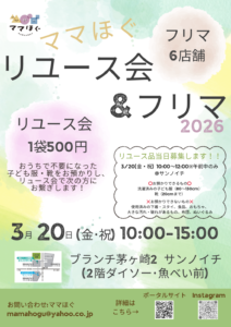 日時 2026年3月20日(金・祝)10:00〜15:00 場所 ブランチ茅ヶ崎2 サンノイチ住所:茅ヶ崎市浜見平3-1アクセスはこちら駐車場ブランチ茅ヶ崎2(3時間無料) 費用 リユース会1袋500円で詰め放題 リユー […]