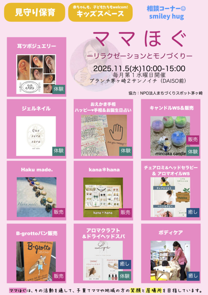 産後孤育てをした経験をしたことから生まれたママほぐは今年で9年目。ここ(ママほぐ)が、ママの居場所になりますように。安心してお出かけくださいね。